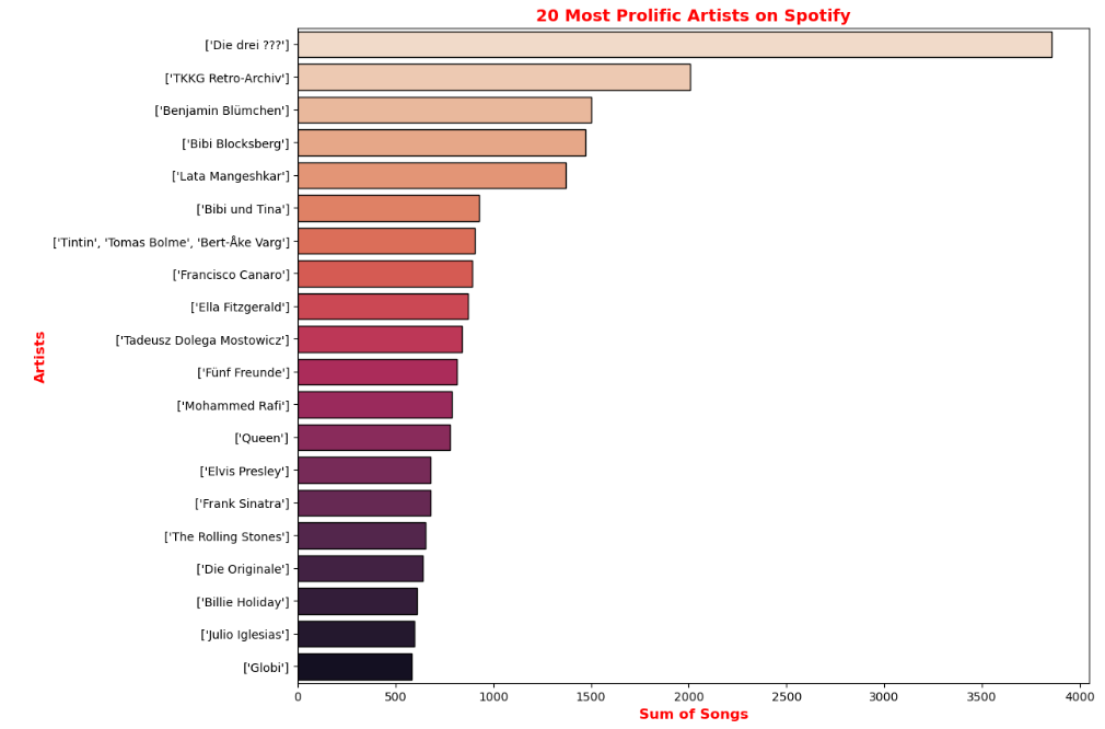 ax.set_title('20 Most Prolific Artists on Spotify', c= 'r', fontsize = 14, weight = 'bold')